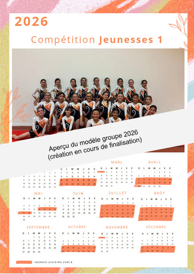 - le calendrier avec une photo de groupe - format A4, 1 page, avec une photo de groupe (suite aux séances de prise de vues réalisées ce début octobre). Si votre enfant n'était pas présent lors de la séance photo de son groupe, nous ne pourrons malheureusement pas vous proposer ce modèle calendrier cette saison.